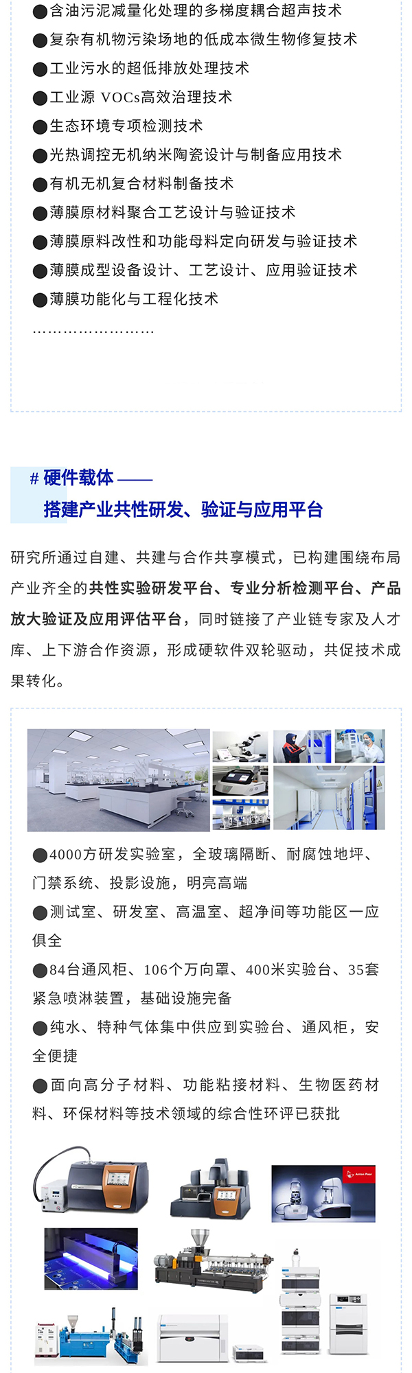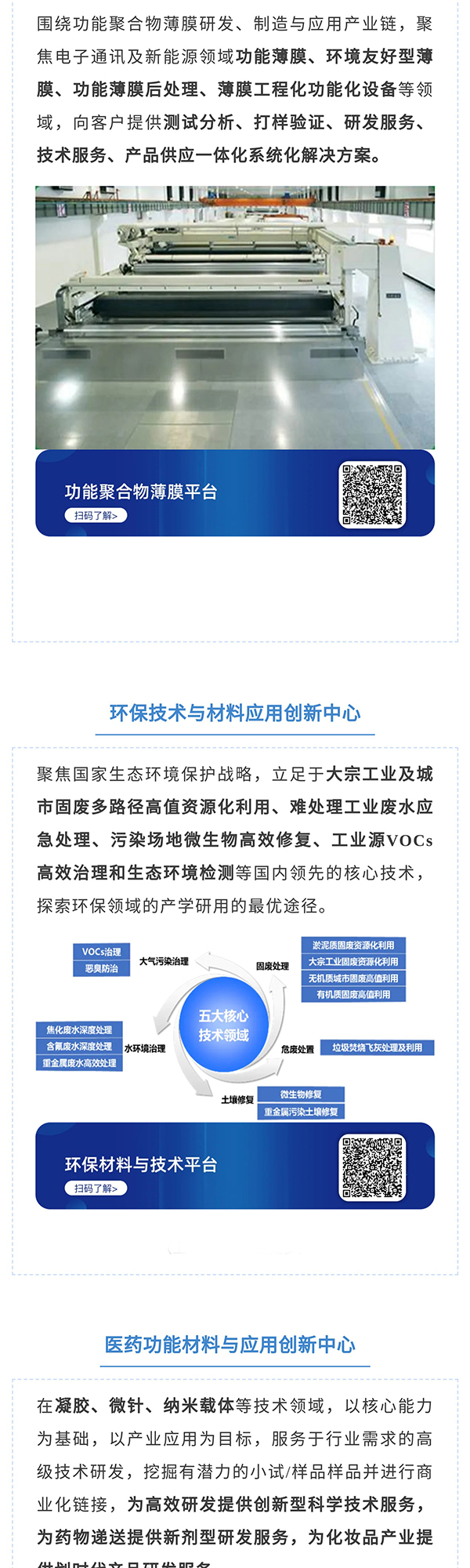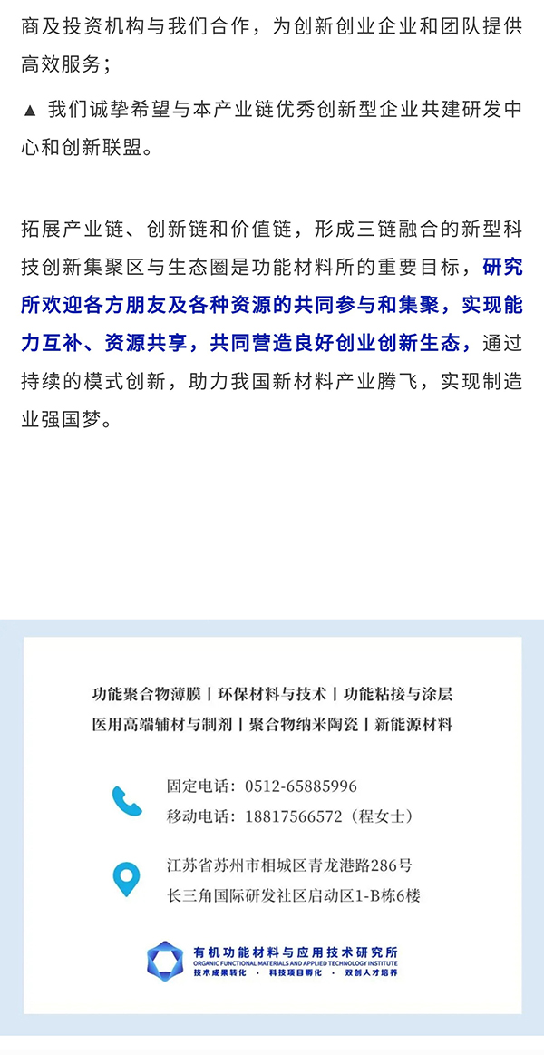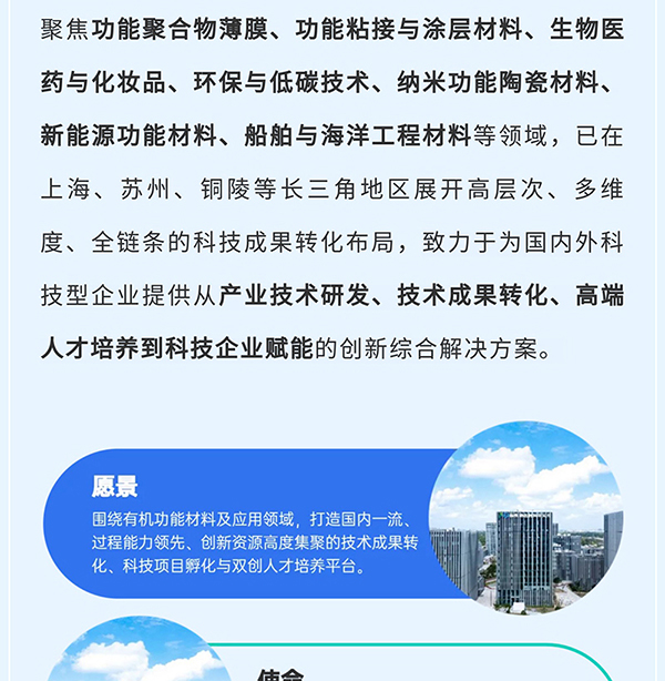 研究所以打造"關(guān)鍵有機功能材料技術(shù)創(chuàng)新與轉(zhuǎn)化、應(yīng)用協(xié)同創(chuàng)新、創(chuàng)新創(chuàng)業(yè)人才培養(yǎng)生態(tài)系統(tǒng)"為使命,以批量、高效、快速實現(xiàn)"卡脖子"關(guān)鍵有機功能材料產(chǎn)業(yè)化應(yīng)用為核心目標,聚焦有機功能材料尤其是中高端有機功能薄膜、功能粘接與涂層材料、醫(yī)藥輔材與新型制劑、功能環(huán)保材料與技術(shù)、國產(chǎn)分析儀器與設(shè)備等領(lǐng)域,搭建"技術(shù)成果轉(zhuǎn)化、科技項目孵化與雙創(chuàng)人才培養(yǎng)"三位一體生態(tài)平臺,打造"技術(shù)增值、精準轉(zhuǎn)化、應(yīng)用推廣、創(chuàng)業(yè)投資和人才培養(yǎng)"五位一體的創(chuàng)新創(chuàng)業(yè)生態(tài)圈。