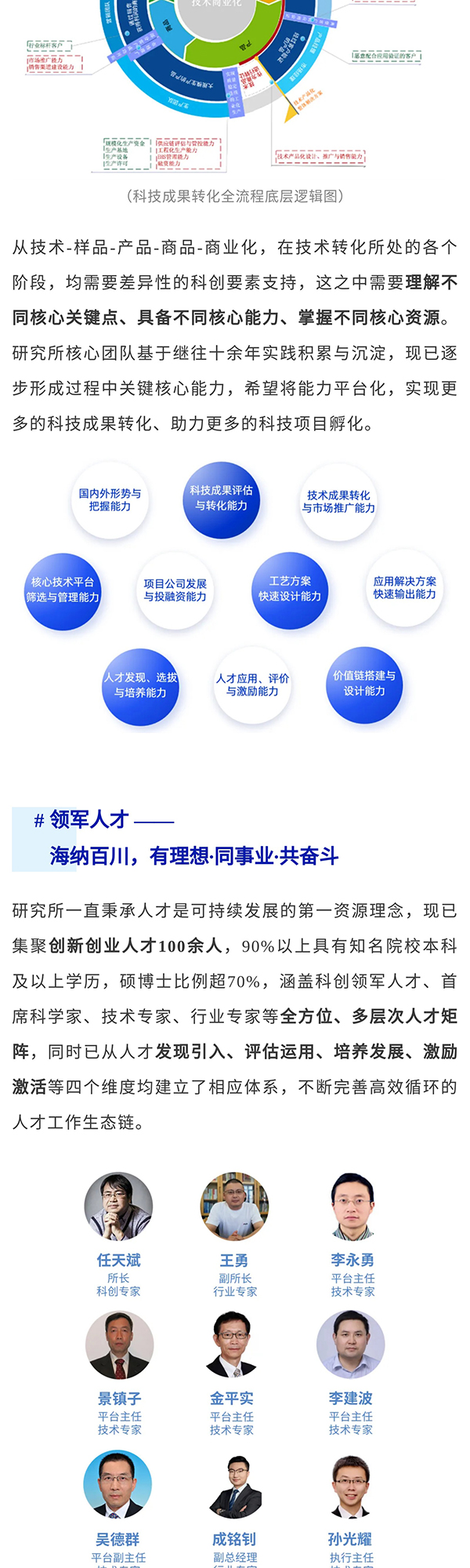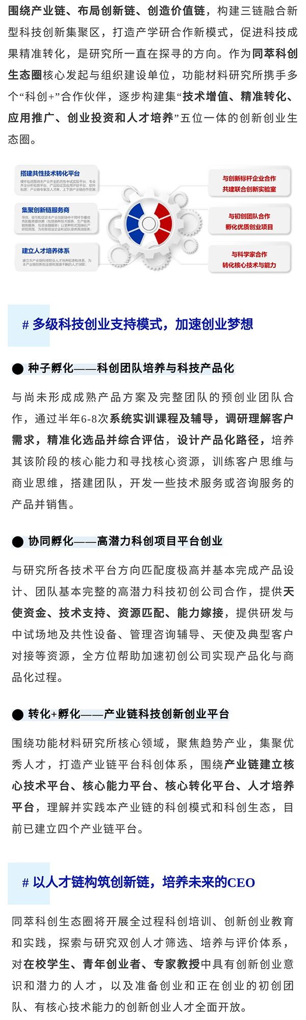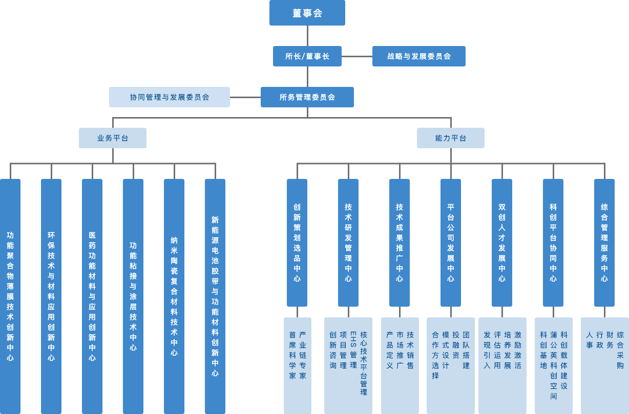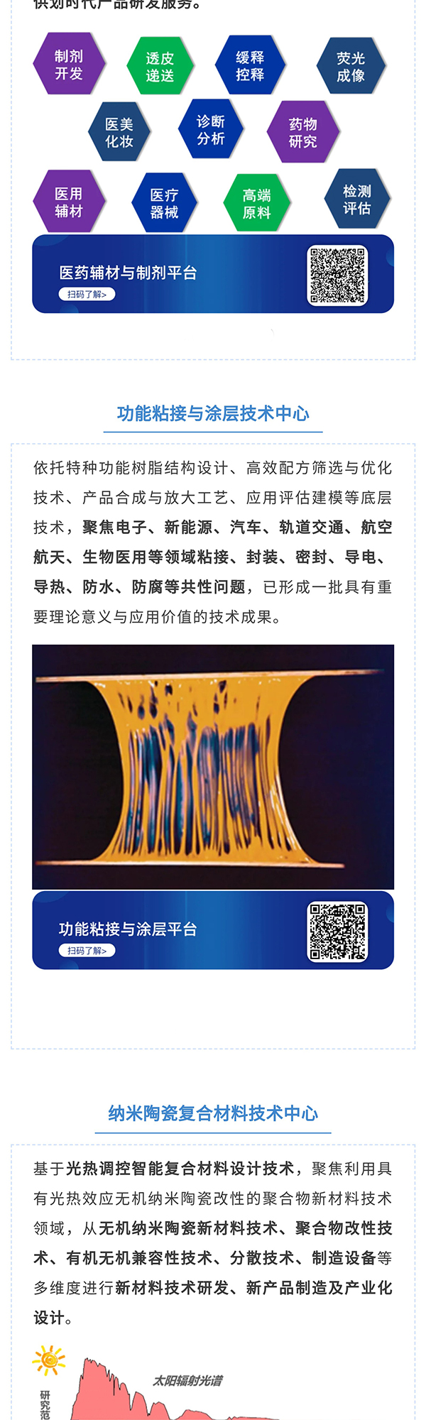 研究所以打造"關(guān)鍵有機功能材料技術(shù)創(chuàng)新與轉(zhuǎn)化、應(yīng)用協(xié)同創(chuàng)新、創(chuàng)新創(chuàng)業(yè)人才培養(yǎng)生態(tài)系統(tǒng)"為使命,以批量、高效、快速實現(xiàn)"卡脖子"關(guān)鍵有機功能材料產(chǎn)業(yè)化應(yīng)用為核心目標,聚焦有機功能材料尤其是中高端有機功能薄膜、功能粘接與涂層材料、醫(yī)藥輔材與新型制劑、功能環(huán)保材料與技術(shù)、國產(chǎn)分析儀器與設(shè)備等領(lǐng)域,搭建"技術(shù)成果轉(zhuǎn)化、科技項目孵化與雙創(chuàng)人才培養(yǎng)"三位一體生態(tài)平臺,打造"技術(shù)增值、精準轉(zhuǎn)化、應(yīng)用推廣、創(chuàng)業(yè)投資和人才培養(yǎng)"五位一體的創(chuàng)新創(chuàng)業(yè)生態(tài)圈。