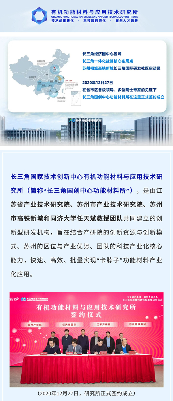 有機功能材料與應(yīng)用技術(shù)研究所(江蘇集萃功能材料研究所有限公司)由江蘇省產(chǎn)業(yè)技術(shù)研究院、蘇州市產(chǎn)業(yè)技術(shù)研究院、蘇州市高鐵新城和同濟大學(xué)任天斌教授團隊共同發(fā)起建立的創(chuàng)新型研發(fā)機構(gòu),旨在結(jié)合產(chǎn)研院的創(chuàng)新資源與創(chuàng)新模式、蘇州的區(qū)位與產(chǎn)業(yè)優(yōu)勢、任天斌教授團隊的科技產(chǎn)業(yè)化核心能力等,共同打造有機功能材料領(lǐng)域集產(chǎn)業(yè)技術(shù)研發(fā)、科技成果轉(zhuǎn)化、高端人才培養(yǎng)和創(chuàng)新企業(yè)賦能等功能于一體的創(chuàng)新高地。