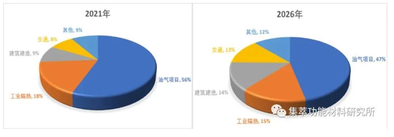 近些年我國氣凝膠產業技術進步顯著,產量快速躍升,已成為全球氣凝膠需求大國之一。2015~2020年國內氣凝膠材料產量年均復合增速為38.5%、氣凝膠制品產量年均復合增速為38.8%。根據IDTechEX報告,目前氣凝膠應用市場有 56%來自油氣項目,18%用于工業隔熱,9%用于建筑建造,8%用于交通。而到 2026 年,將有 14%用于建筑,而交通領域的需求將增至 13%。