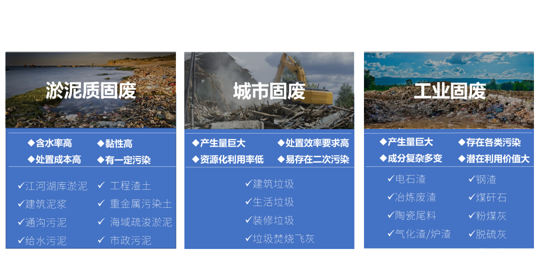 與此同時,全國積極推進“無廢城市”建設,對各類固廢(淤泥質固廢、城市固廢、工業固廢)處置提出了更高的需求——持續推進固廢高值化綠色化循環利用,延伸固廢產業鏈成為各個城市綠色發展的重心。