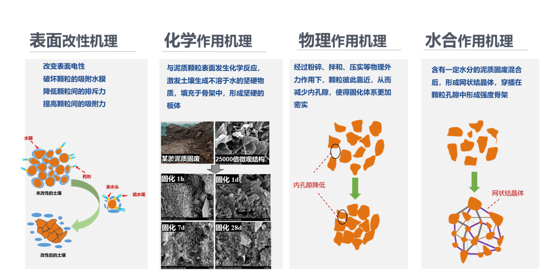 在關鍵藥劑方面,環保中心自主研發出了萃路克復合穩定劑(TriRock,寓意:三倍石頭強度),可以應用于不同場景下的不同理化性質固廢。該藥劑通過表面改性、化學作用、物理作用、水合作用等多種作用耦合,破壞固廢顆粒的吸附水膜,使其從親水性變為疏水性,并形成不溶于水的堅硬物質和網狀結晶體,填充在骨架中,在施工過程中經過粉碎、拌合、平整、壓實等物理外力下,使得固化體系更加密實,具有高強的路用性能,同時可對各類污染物進行高效固定,實現固廢安全穩定應用。